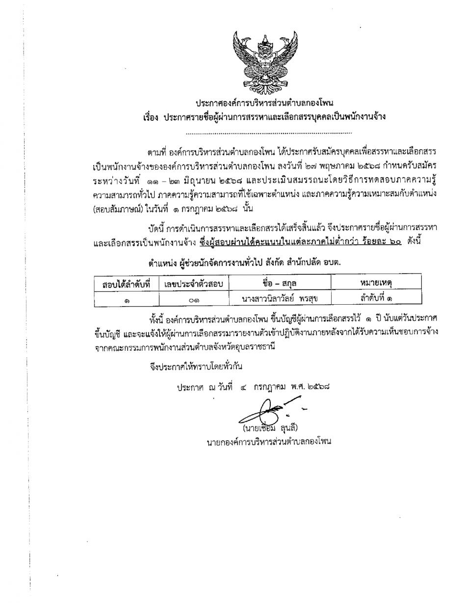 ประกาศองค์การบริหารส่วนตำบลกองโพน เรื่อง ประกาศรายชื่อผู้ผ่านการสรรหาและเลือกสรรบุคคลเป็นพนักงานจ้าง[4 กรกฎาคม 2568]