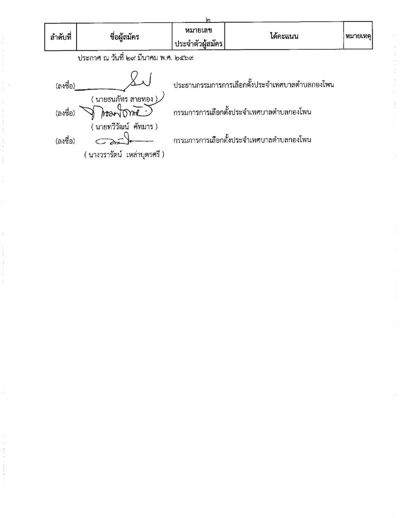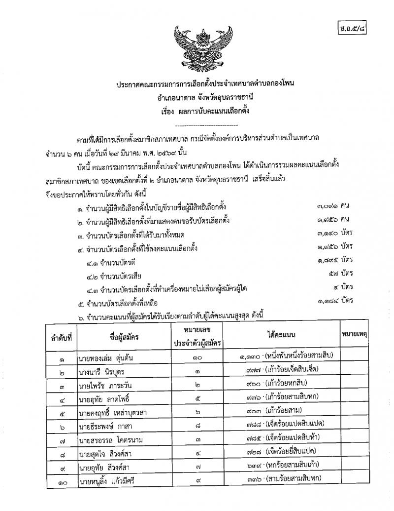 ประกาศคณะกรรมการการเลือกตั้งประจำเทศบาลตำบลกองโพน อำเภอนาตาล จังหวัดอุบลราชธานี เรื่องผลการนับคะแนนเลือกตั้ง นายกเทศมนตรีและสมาชิกสภาตำบลกองโพน