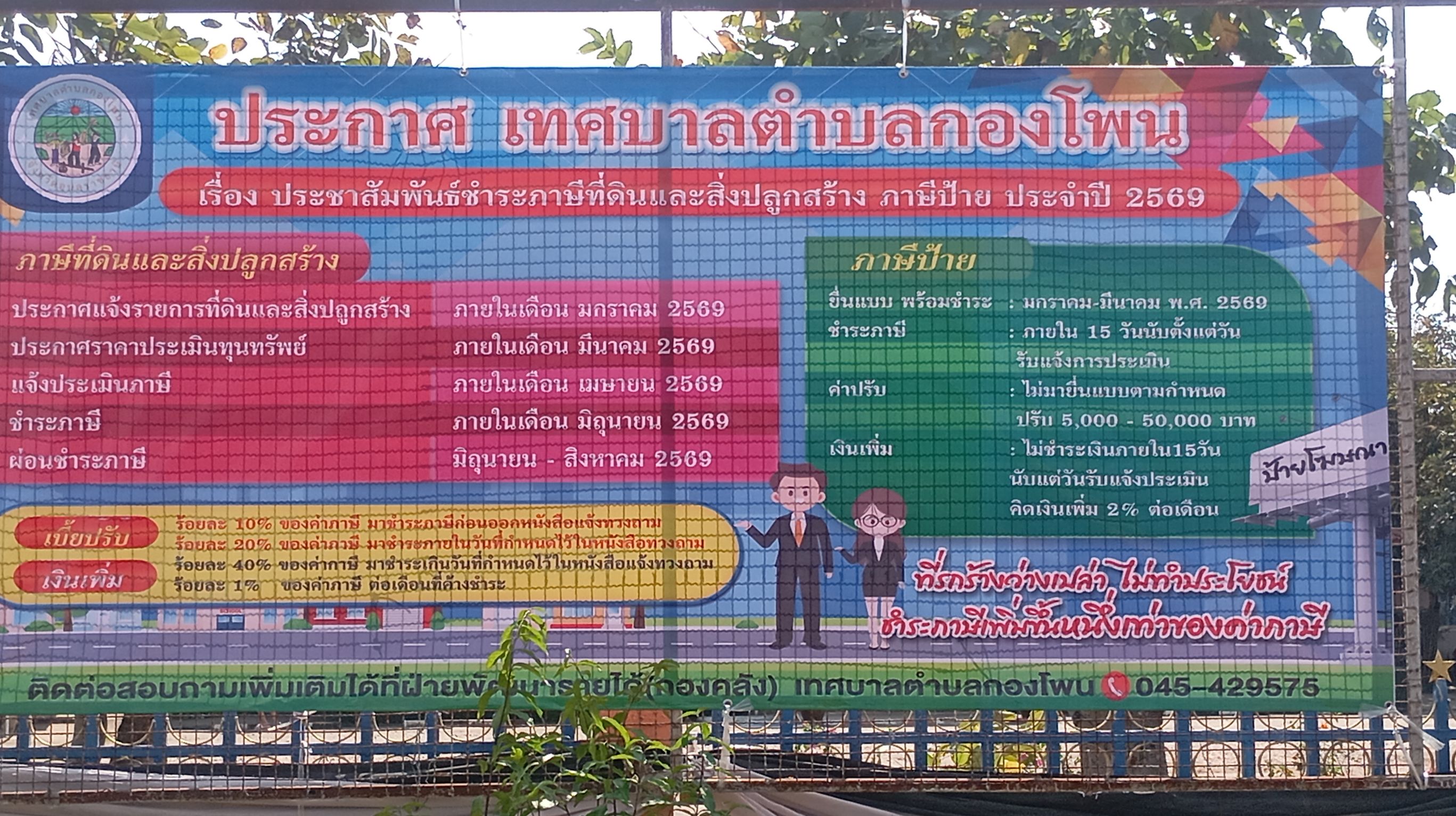 ประกาศเทศบาลตำบลกองโพน เรื่อง ประชาสัมพันธ์การชำระภาษีที่ดินและสิ่งปลูกสร้าง ภาษีป้าย ประจำปี 2569
