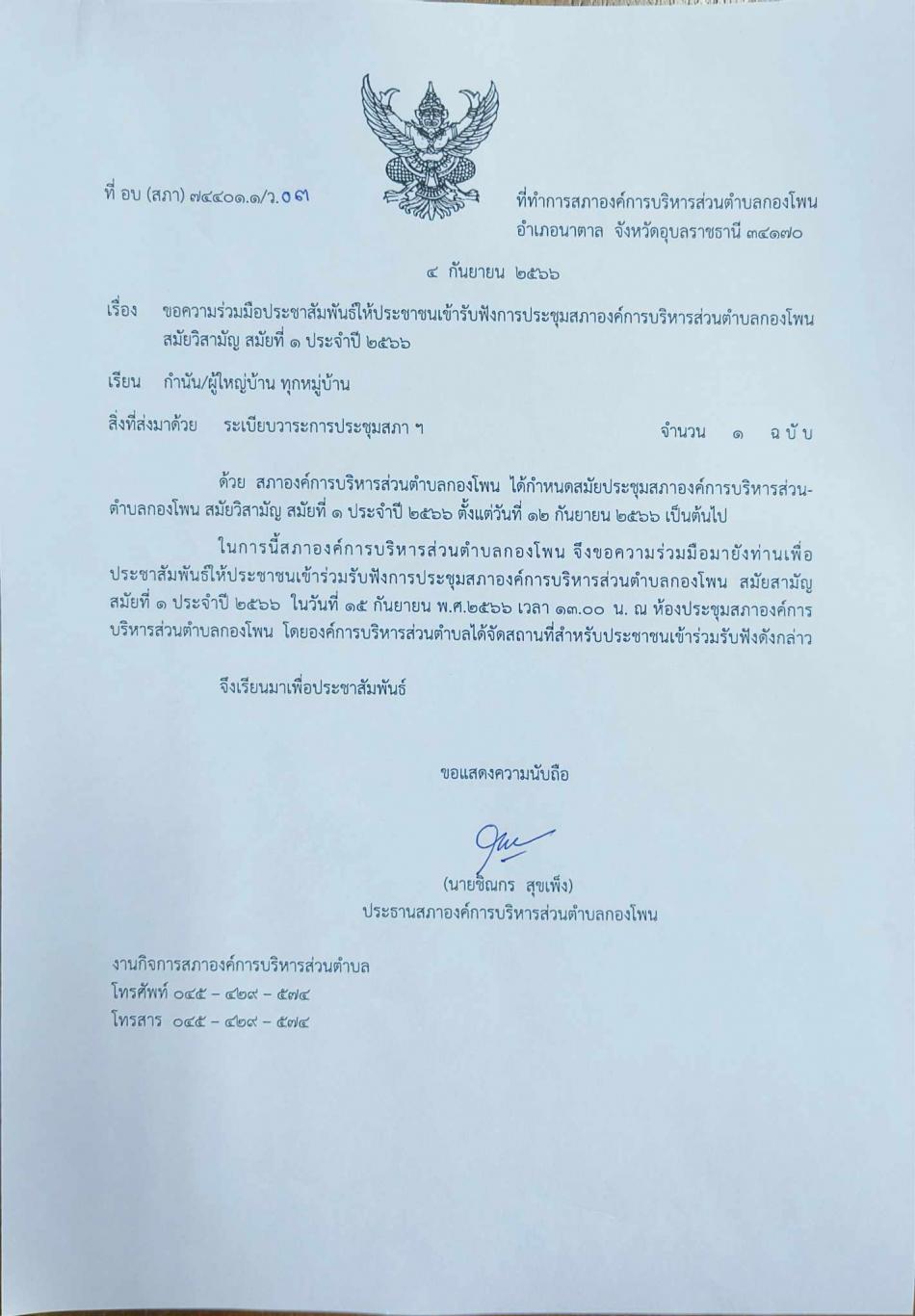 ขอความร่วมมือประชาสัมพันธ์ประชาชนรับฟังการประชุมสภาองค์การบริหารส่วนตำบลกองโพน สมัยวิสามัญ สมัยที่ 1 ประจำปีงบประมาณ2566[5 กันยายน 2566]