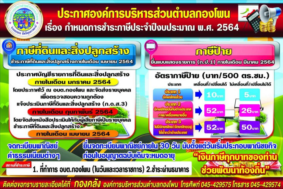 ประกาศองค์การบริหารส่วนตำบลกองโพน เรื่อง กำหนดการชำระภาษีประจำปีงบประมาณ พ.ศ.2564 [7 มกราคม 2564]