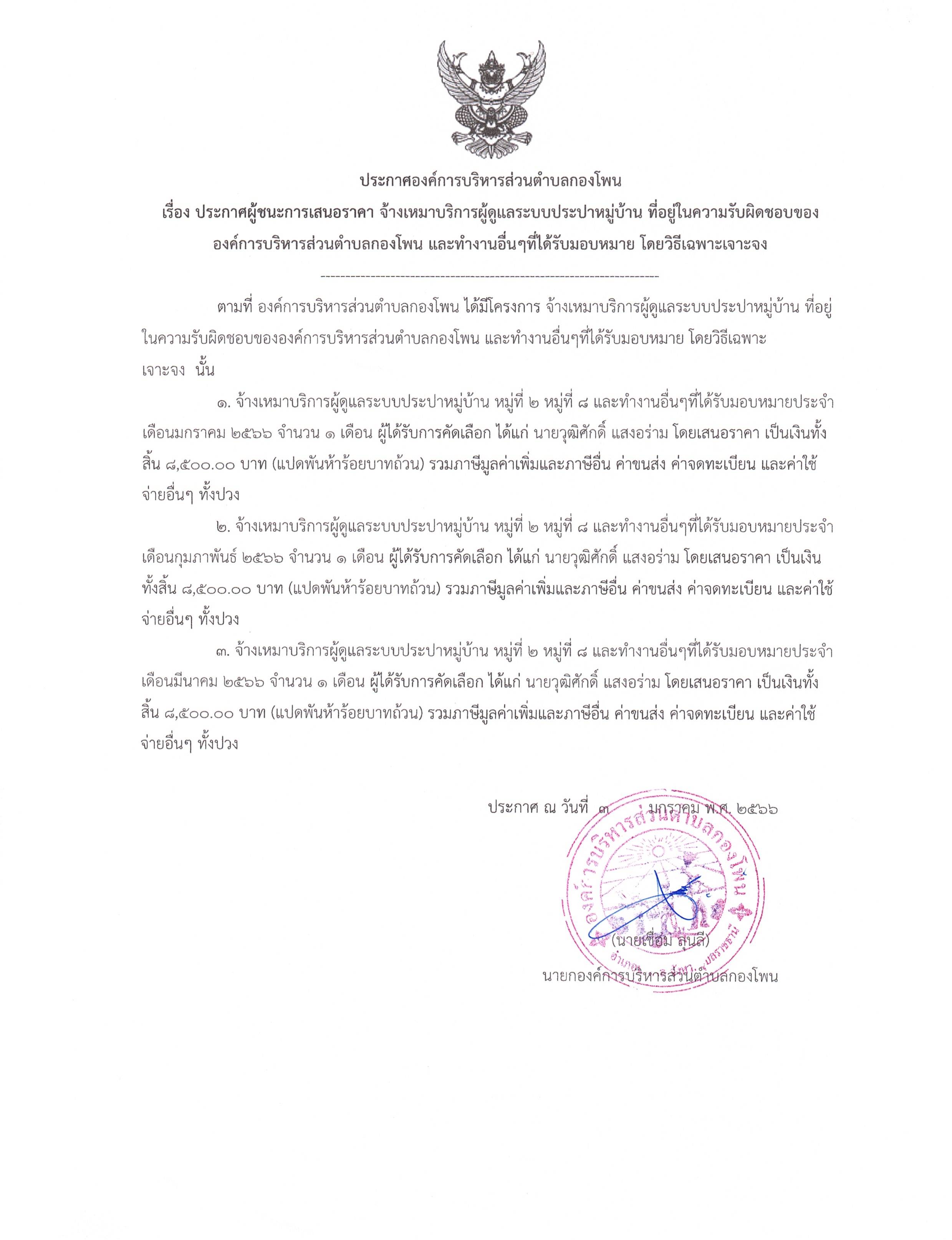ชื่อเรื่อง : ประกาศองค์การบริหารส่วนตำบลกองโพน เรื่อง ประกาศรายชื่อผู้ชนะการเสนอราคา จ้างเหมาบริการผู้ดูแลระบบประปาหมู่บ้าน ที่อยู่ในความรับผิดชอบขององค์การบริหารส่วนตำบลกองโพน และทำงานอื่นๆที่ได้รับมอบหมาย โดยวิธีเฉพาะเจาะจง