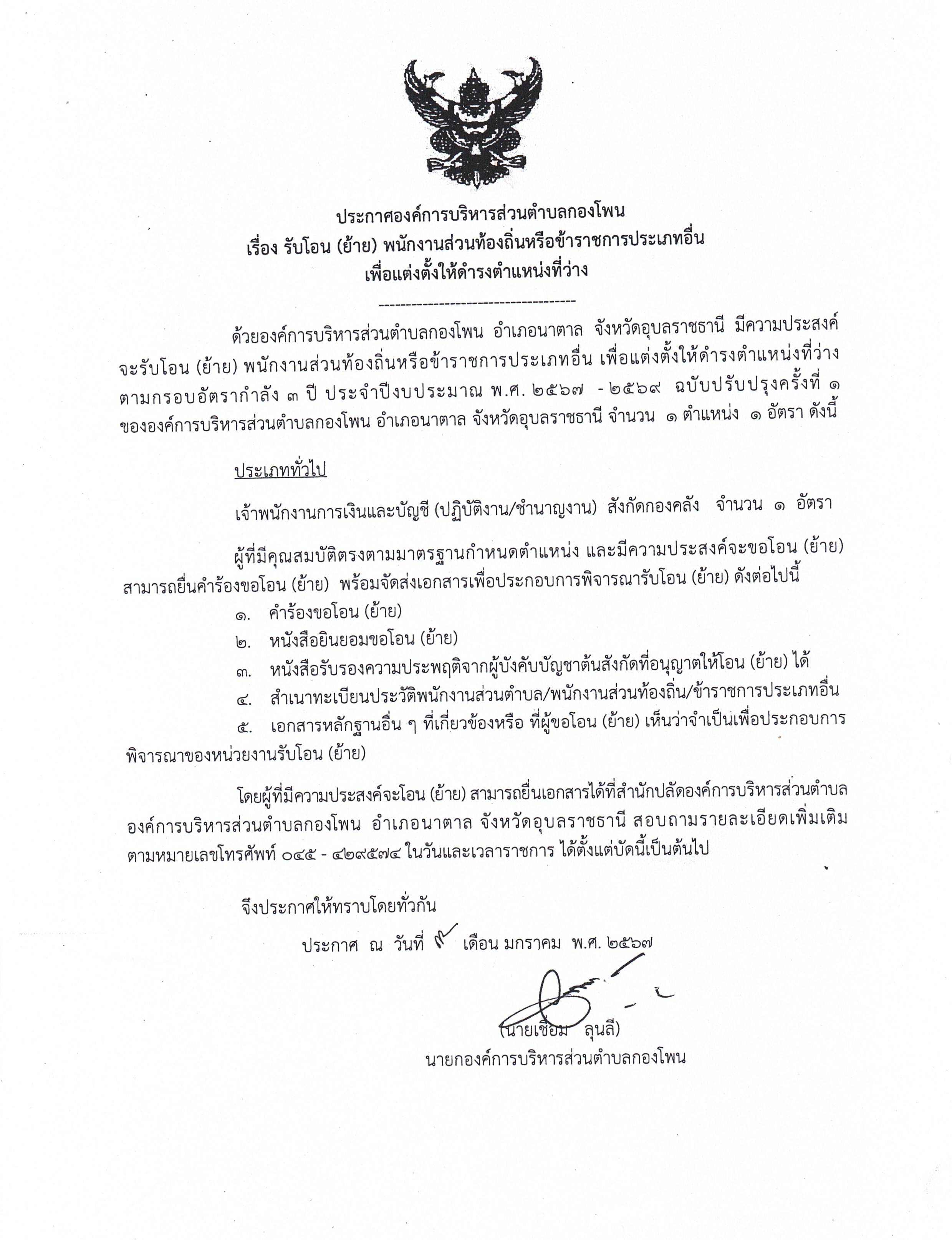 ประกาศองค์การบริหารส่วนตำบลกองโพน เรื่อง รับโอน(ย้าย)พนักงานส่วนท้องถิ่นหรือข้าราชการประเภทอื่นเพื่อแต่งตั้งให้ดำรงตำแหน่งที่ว่าง
